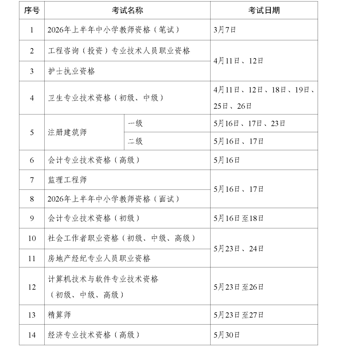为切实做好专业技术人员职业资格考试规划与管理工作,方便广大专业技术人员参加职业资格考试,经征求有关部门同意,现就2026年度专业技术人员职业资格考试工作计划及有关事项通知如下: